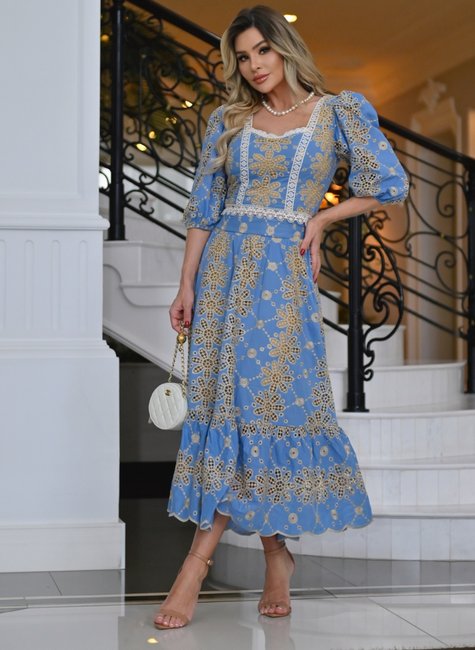 Conjunto cropped e saia midi em algodão com bordado vazado richelieu. Cropped forrado mais alongado com bico de rendinha floral, manga bufante, zíper destacavél e amarração com pompom artesanal. Saia forrada com zíper de metal e barrado. Conjunto com detalhes incríveis.