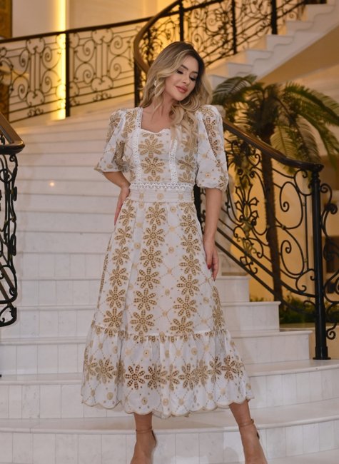 Conjunto cropped e saia midi em algodão com bordado vazado richelieu. Cropped