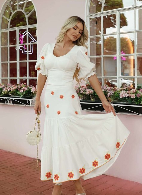 Conjunto Off-White em Linho Natural com Bordado Floral – Sofisticação e Exclusividade . O Conjunto é a perfeita combinação de elegância, delicadeza e exclusividade. Confeccionado em linho natural, um tecido nobre e atemporal, este conjunto foi criado para mulheres que valorizam qualidade, caimento impecável e detalhes refinados. Seu bordado floral exclusivo traz um toque artesanal e sofisticado, tornando a peça única e especial. Saia Midi em Linho Natural : A saia midi possui um caimento fluido e estruturado, ideal para um visual sofisticado e confortável. Seu design minimalista é realçado pelo bordado floral exclusivo, que adiciona charme e personalidade à peça. O zíper de metal na parte traseira garante um ajuste perfeito, enquanto o forro interno proporciona leveza e segurança ao vestir. Cropped com Mangas Bordadas: O cropped complementa o conjunto com um toque de delicadeza e sofisticação. Suas mangas bordadas trazem um acabamento artesanal impecável, enriquecendo ainda mais o design. O bojo interno oferece sustentação e conforto, garantindo um caimento estruturado e elegante. O fechamento em zíper de metal nas costas confere um ajuste preciso e acabamento refinado.