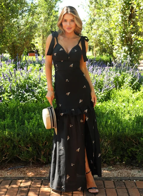 O Vestido Blooming é a tradução da flor que nasce na noite. Feito em liocel, tecido leve que se assemelha à seda pelo toque macio e caimento fluido, ele envolve o corpo com delicadeza e movimento. Na cor preto profundo, ganha contraste poético com mini bordados florais em forma de pequenos buquês, como flores que desabrocham sob a luz da lua. A modelagem longa alonga a silhueta, enquanto o busto com bojo estruturado é suavemente contornado por rendinha delicada, trazendo romantismo ao desenho. As alças de amarrar reguláveis permitem ajuste perfeito. Nas costas, o recorte em lastex garante conforto e adaptação ao corpo, com fechamento por zíper. A saia longa possui recorte abaixo do quadril com babado fluido, criando movimento leve, além de fenda frontal, que revela sutileza e feminilidade na medida certa. Um vestido romântico, delicado e marcante — como flores que florescem na alma.
