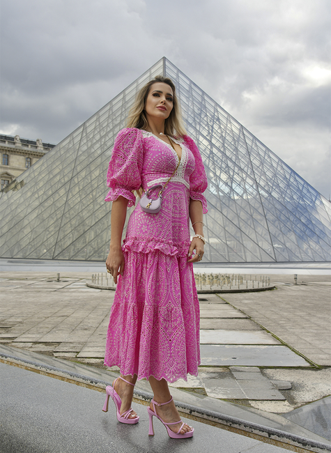 Vestido no comprimento maxi midi em laise de algodão bicolor, com mangas bufantes, punho e barrado. O vestido é charmoso e muito feminino. Modelagem mais ajustada no busto e soltinha na saia, com rendinha floral nos recortes e decote.