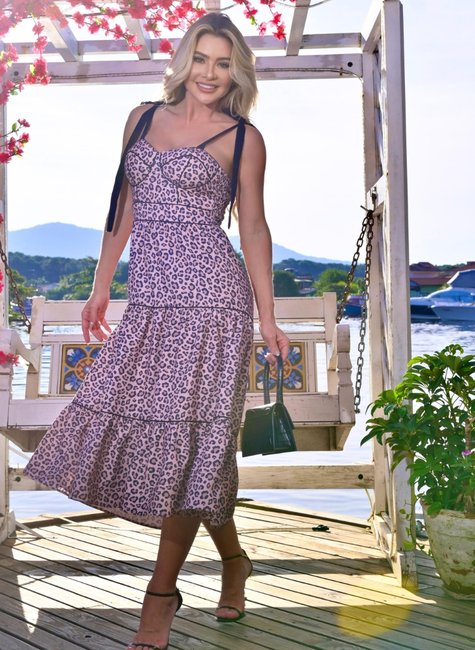 Vestido em alfaiataria com estampa exclusiva animal print. Bojo corset contornando em vivo preto, alças de amarrar reguláveis, forro, saia com recortes e vivo preto, costas com zíper de metal e recorte. Vestido Amy é muito elegante e feminino.