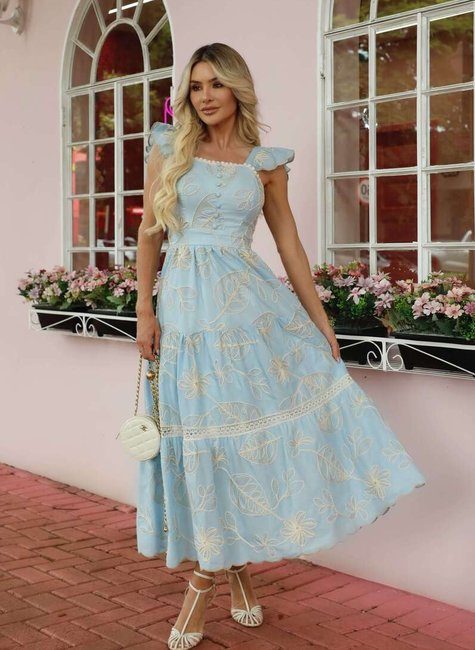 Vestido Midi Azul Bebê em Algodão com Bordado Cordonê – Elegância, Delicadeza e Sofisticação. O Vestido Midi Azul Bebê em Algodão é a escolha ideal para quem busca uma peça sofisticada, delicada e cheia de charme. Confeccionado em algodão de alta qualidade, este vestido une conforto e frescor, perfeito para ocasiões especiais ou para um look sofisticado diurno. O bordado cordonê, os detalhes como o botão decorativo encapado à mão e as alças com babadinho garantem que cada aspecto do vestido seja repleto de estilo e exclusividade. Design Midi com Detalhes Encantadores - O comprimento midi proporciona um look elegante e atemporal, as alças com babadinho adicionam um toque de charme romântico à peça, tornando-a ainda mais delicada. O botão decorativo encapado à mão no busto é um detalhe artesanal que eleva o visual da peça, conferindo um toque de sofisticação.