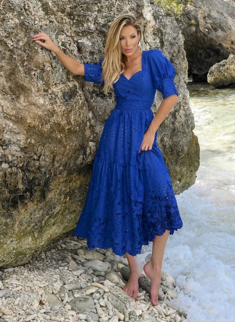 Vestido midi em algodão com bordado de flores 3D. Possui decote coração, manga princesa com punho e botões funcionais, lastex nas costas e amarração com pompom artesanal, forrado com a modelagem mais ajustada no busto e soltinha na saia. Cor vibrante e intensa.