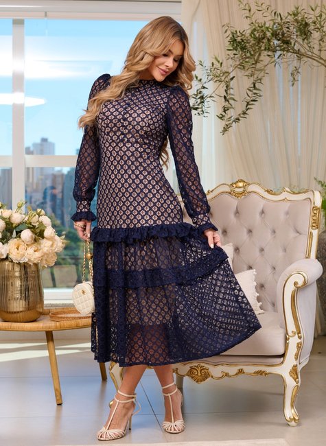 O Vestido Dalila é pura poesia vestida em renda. Sua tonalidade azul marinho evoca mistério e sofisticação, enquanto a transparência suave da manga e o forro nude revelam com delicadeza a beleza dos detalhes.