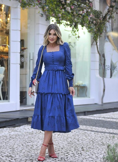 Vestido midi manga longa em viscose premium com flores bordadas. Decote quadrado, botões encapados, bojo fino e macio, forro e zíper de metal nas costas. Punho com lastex e mini babadinho nos recortes da saia. Acompanha cinto encapado artesanalmente. A cor azul marinho é versátil, intensa e profunda, mescla elegância e poder.
