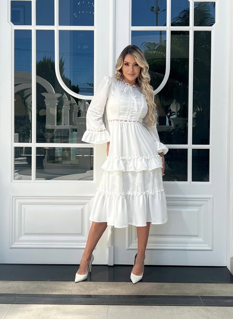 Vestido midi em alfaiataria leve, com mix de laise de algodão, entremeios de flores, mini laço na gola, manga flaire, zíper, forro e no comprimento do vestido um lindo recorte e babado. O vestido Docura é uma peça fofa e especial!