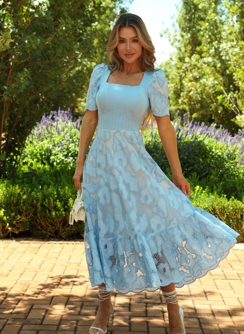 O Vestido Elise é a tradução da feminilidade clássica em tons de azul bebê. Uma peça que une leveza, estrutura e romantismo em perfeita harmonia. Confeccionado em algodão com bordado richelieu, ele traz textura e sofisticação artesanal. O busto em alfaiataria lisa cria contraste elegante com a saia bordada, enquanto as nervuras na pala do cós valorizam a silhueta com delicadeza. Possui barbatanas flexíveis no busto, oferecendo sustentação suave e melhor estrutura. As mangas bordadas em richelieu reforçam o romantismo da peça.A saia em algodão bordado richelieu com barrado trabalhado acrescenta movimento e acabamento refinado. Nas costas, o recorte com lastex proporciona conforto e adaptação ao corpo. O vestido é totalmente forrado e possui fechamento por zíper de metal, garantindo acabamento impecável. Elise é delicado, estruturado e eternamente feminino.