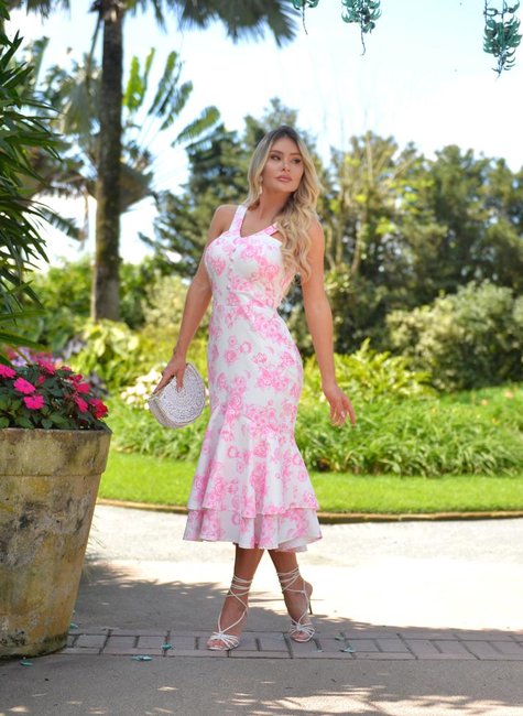 Vestido no comprimento midi confeccionado em alfaiataria premium, encorpada, macia e com elastano. O vestido Florescer possui estampa floral exclusiva da marca com bojo, ziper, forro e babado sereia.
