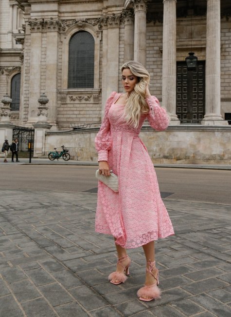 Vestido midi em renda com relevo de flor, decote quadrado, bojo, manga princesa com