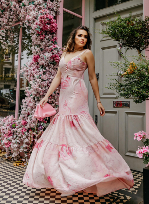 Vestido no comprimento longo em crepe com estampa exclusiva. Possui alças finas, bojo macio, botões de pérola e ziper de metal. O vestido Pôr do Sol tem cor rosê estampado em um tom super delicado, o vestido é glamuroso e elegante.