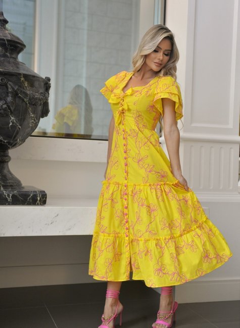 com leve babado na saia. O vestido Raio De Sol tem a cor amarela que desperta, traz leveza,