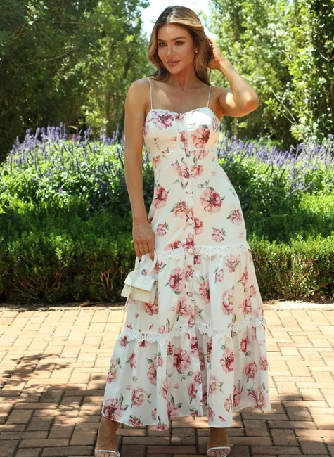 Com salto delicado ou sandália minimalista, ele se transforma em pura elegância floral.