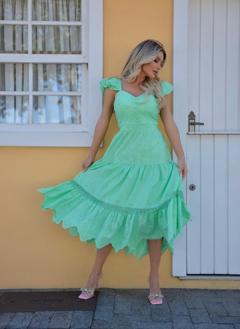 Vestido midi em laise de algodão, bojo fino, botões encapados, manga com babados duplo, zíper de metal nas costas, vestido todo forrado, recorte na saia com aviamentos tingidos a mão. O vestido Summer tem a cor verde claro que representa bem o verão, transmite frescor, equilibrio e harmonia. Perfeito pra voce!