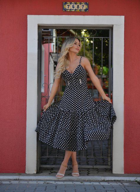 Vestido midi em linho natural bordado, bojo, alça fina, botões de pérola, zíper de metal nas costas e forro. O vestido Sunflower tem a cor preta de fundo com bordados de flor no off-white, o contraste perfeito!