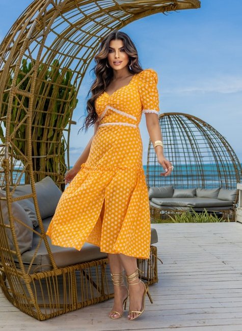 Vestido no algodão bordado no comprimento midi. Possui ziper, forro, pala especial no cós, manga drapeada e lastex na lateral das costas para um conforto maior. Na saia possui recorte com mini babado e fenda. Seu design feminino adiciona um toque de cor e sofisticação ao seu guarda-roupa.