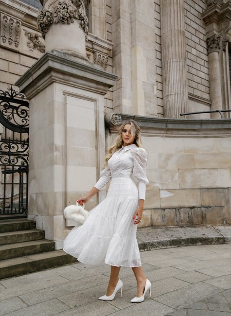 Vestido na cor off whitte no comprimento midi em Chiffon bordado, com mangas bufantes, punho largo e botões funcionais. O vestido Valentina tem a gola no modelo clássico e recorte princesa no busto que dá todo o charme à peça.